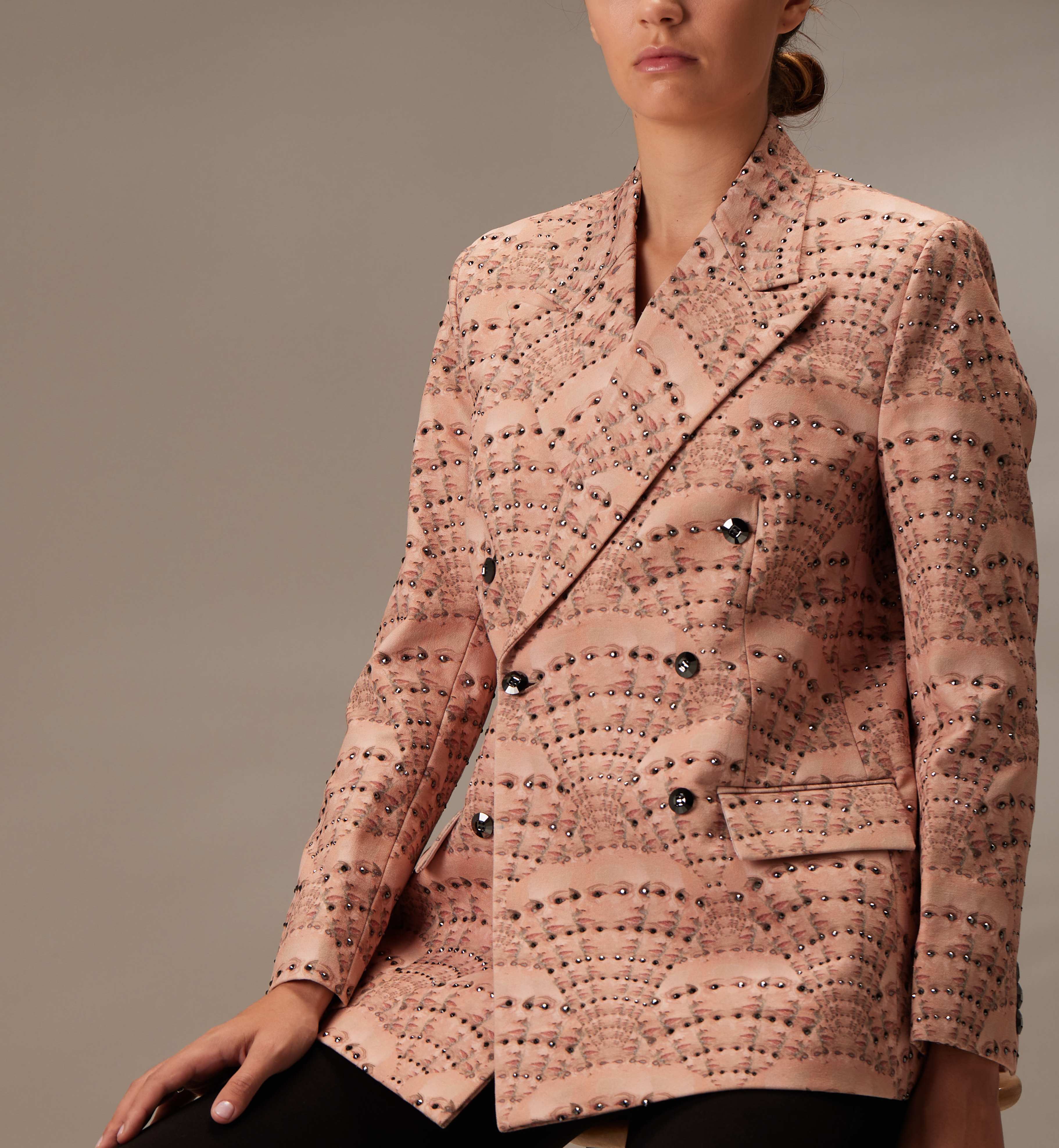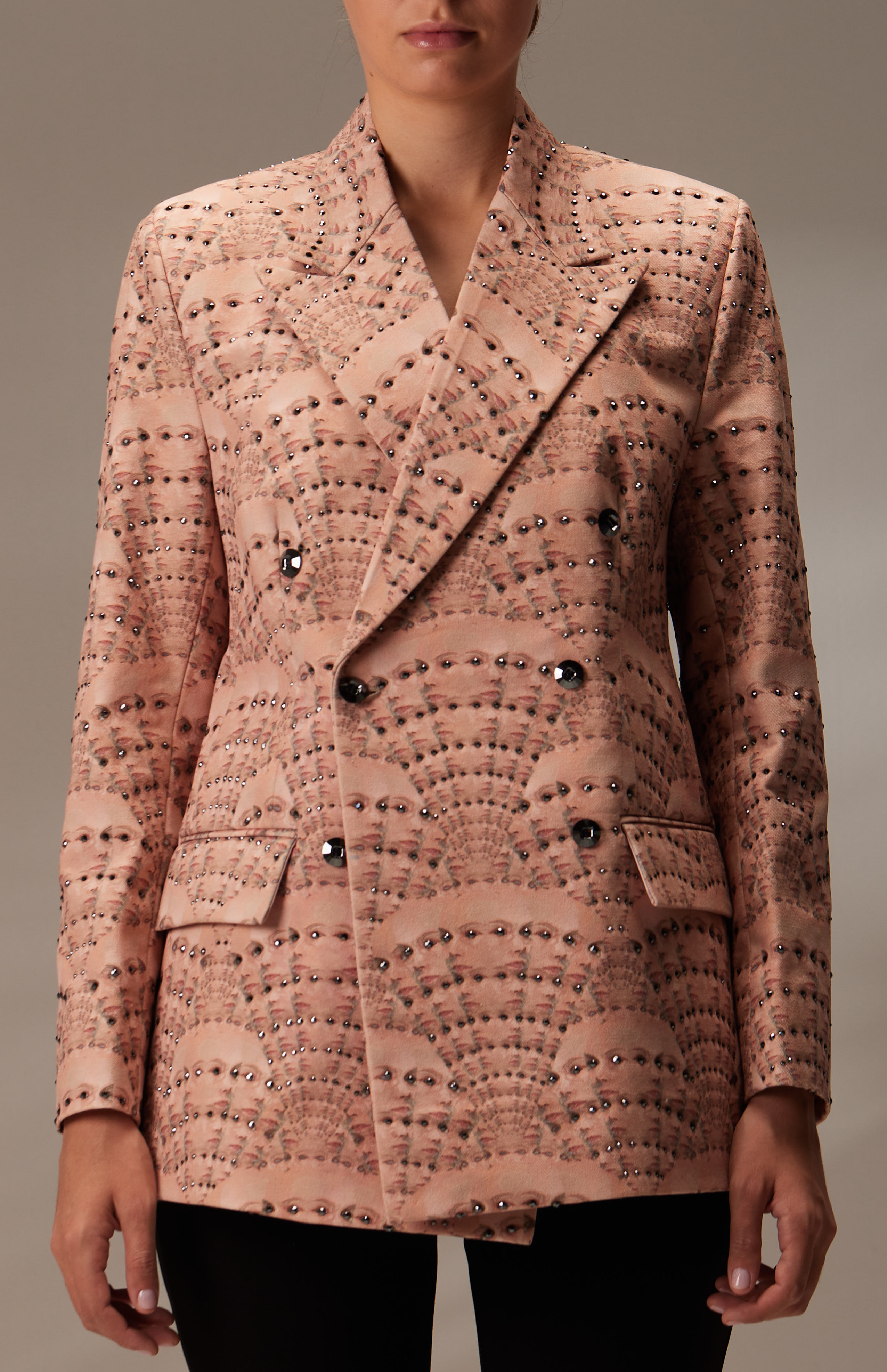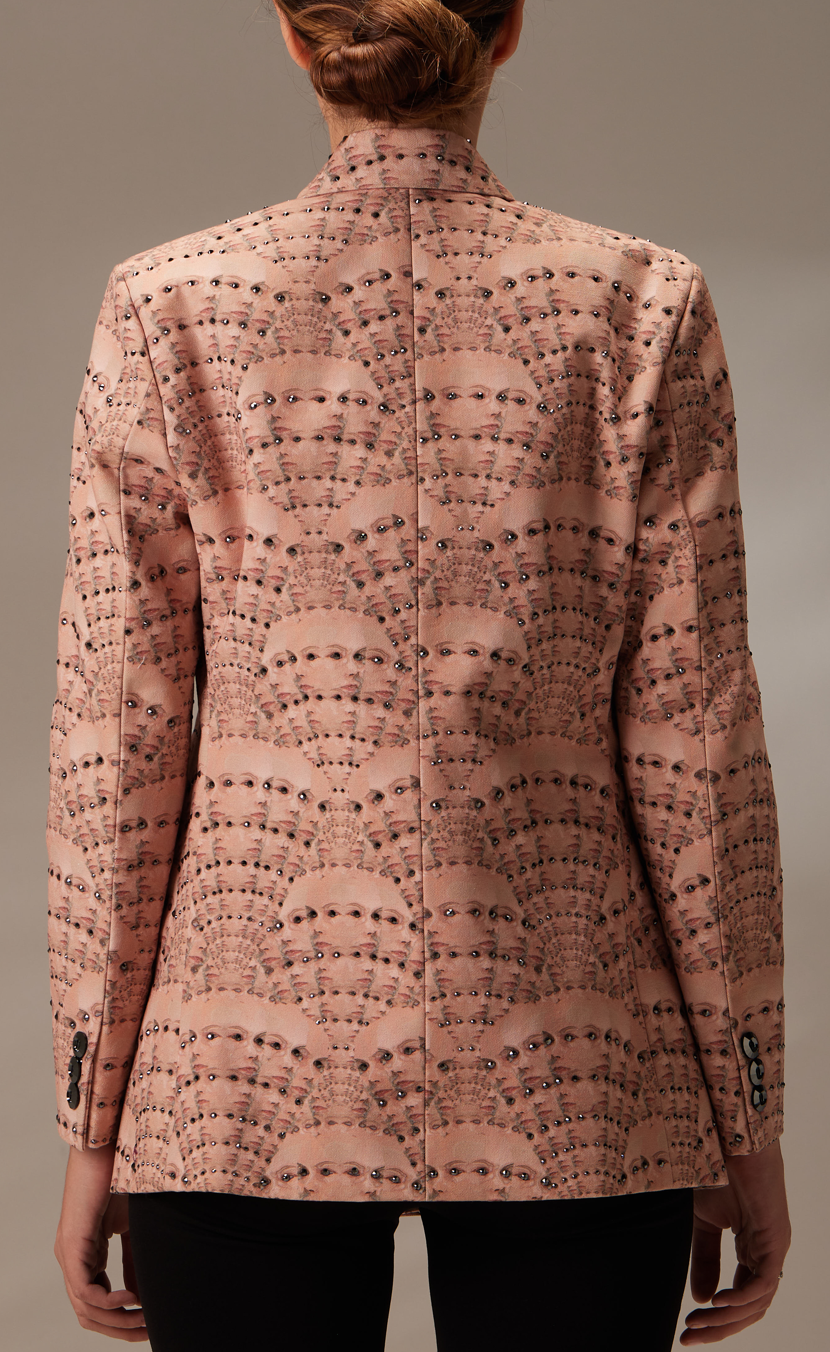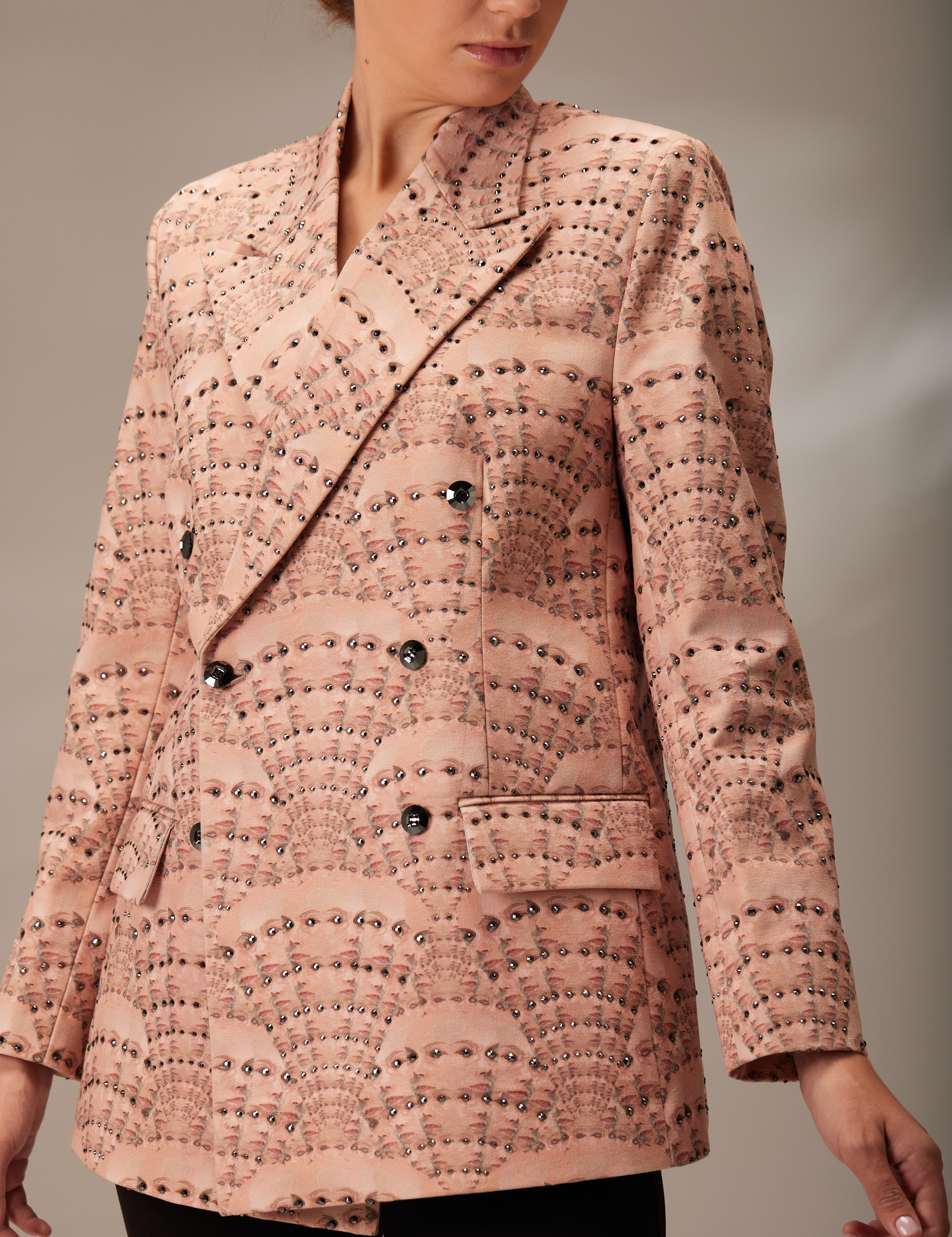 The designed fabric is printed on 100% cotton canvas. Each part of this article is perfectly hand-sewn, with attention to every detail, from beads to Swarovski buttons. Enriching the jacket are hand-applied Swarovski crystals, bringing well-deserved attention to the intriguing yet captivating patterns that adorn the jacket.