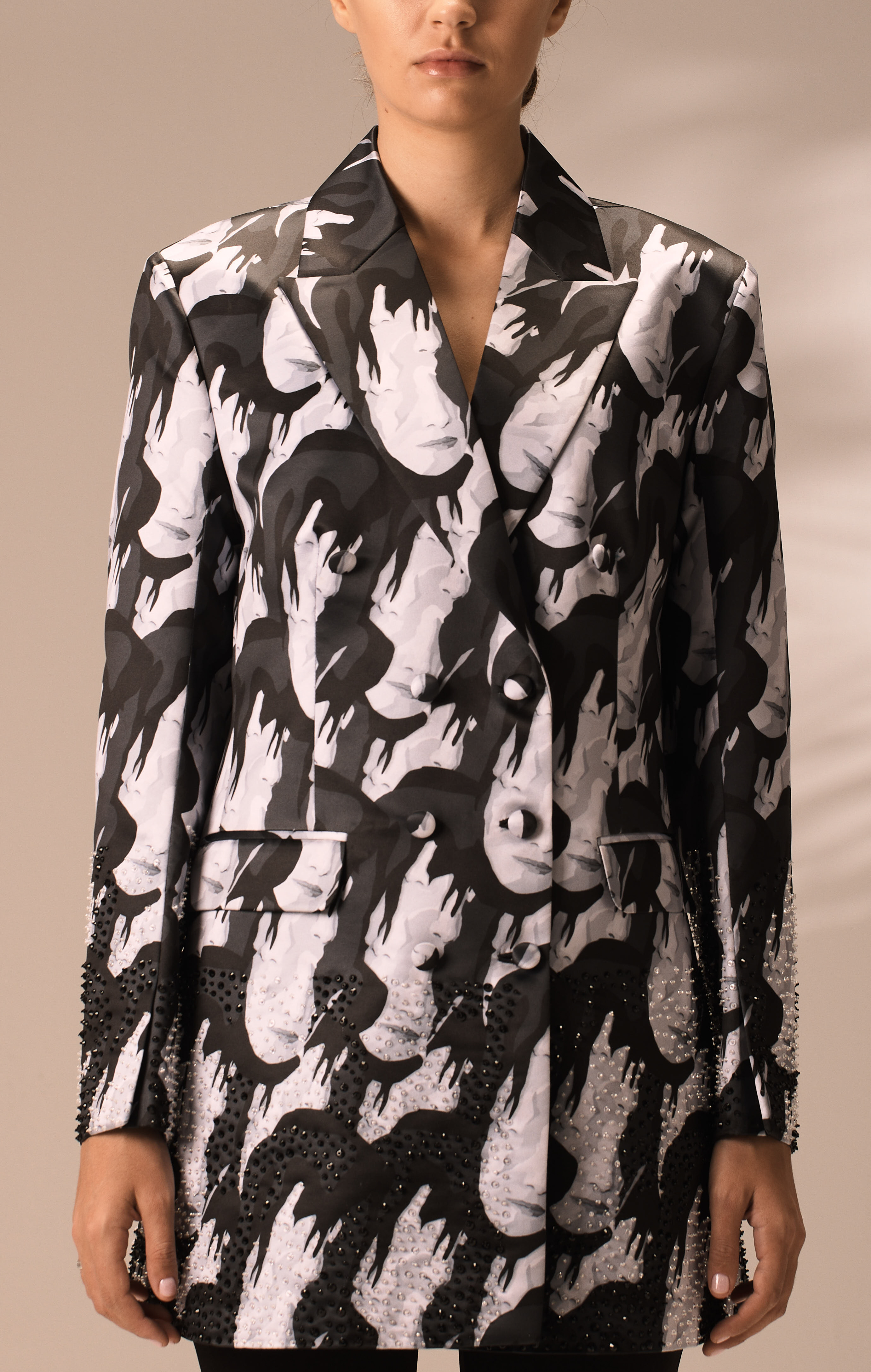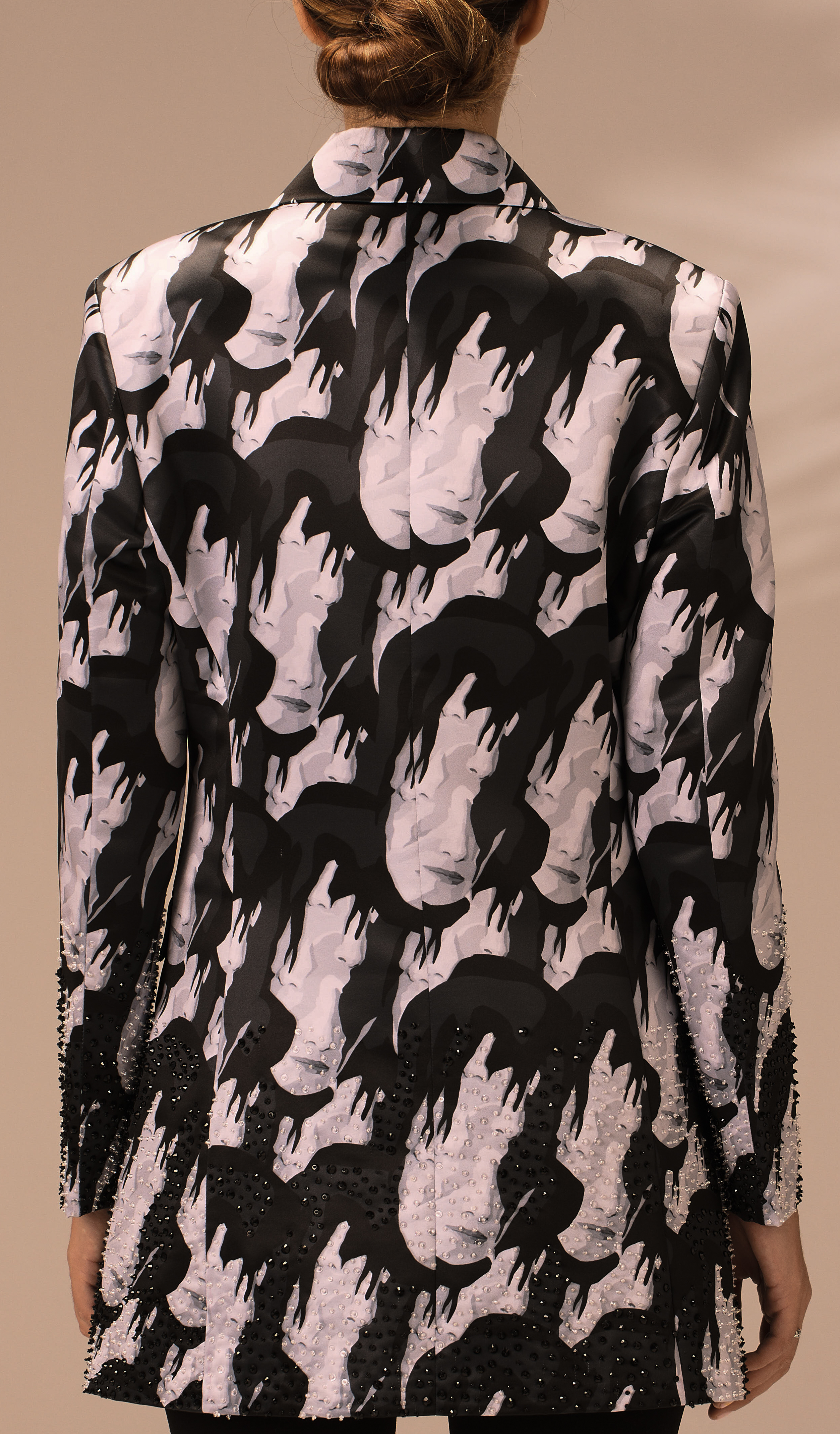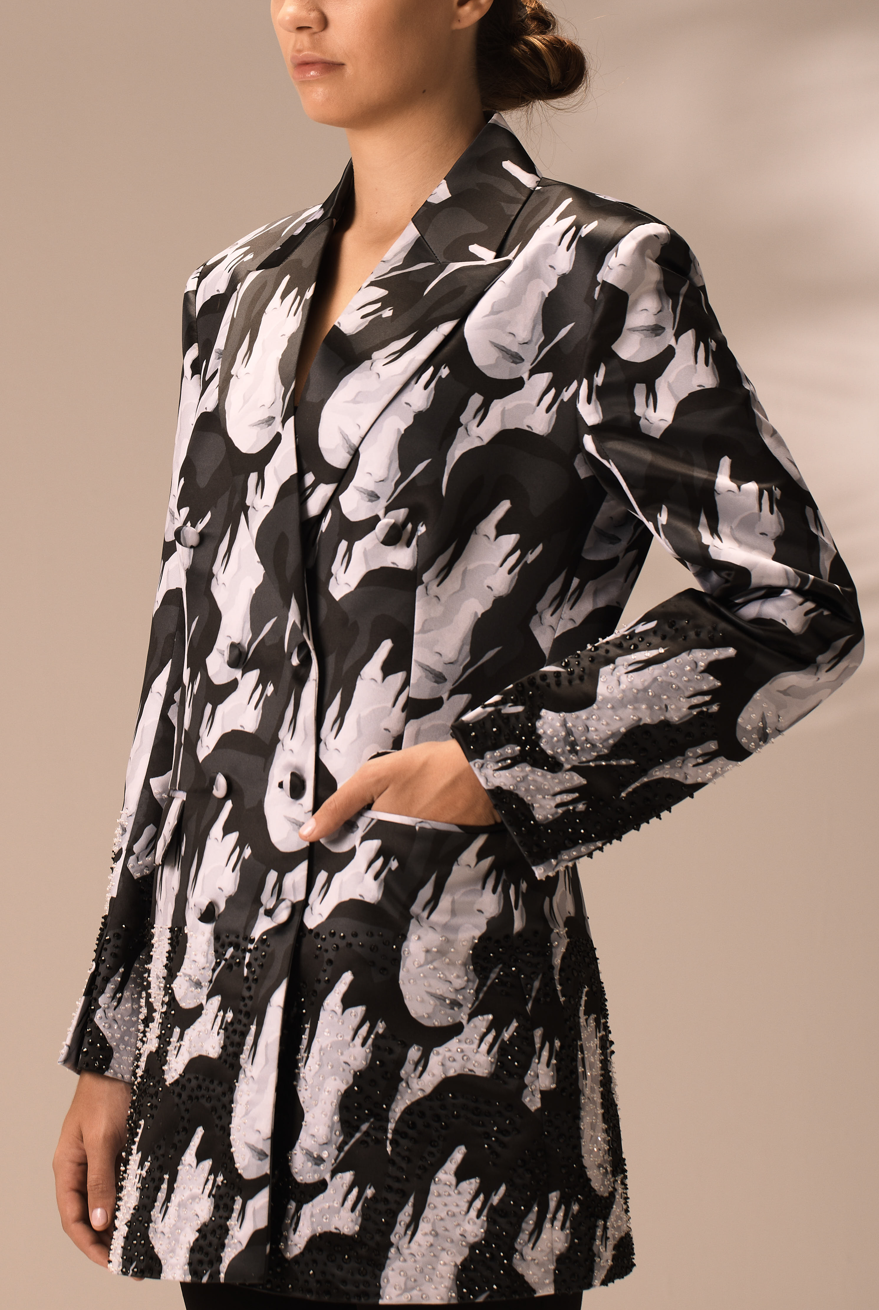 This exquisite jacket is exclusively created by AYART and is printed in Canada on soft satin. The jacket is thoroughly hand-sewn, and our talented artisans dedicate their time and effort to ensure perfection, from its lavish beads to its buttons. Detailing the jacket are hand-applied crystal embroideries that are carefully hand-stitched by a team of three expert artisans.